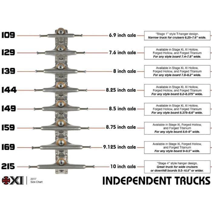Independent Trucks sizing chart including universal sizing comparison axle lengths and suggested sizing for deck widths. If you like Indys 144 stage 11s would be fine. 775 Deck 50 Trucks 80 Deck 525 Trucks 825 Deck 55 Trucks.
